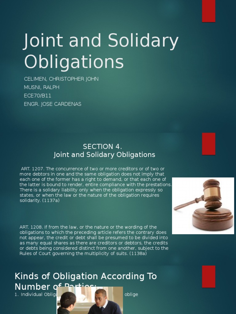 Example Of Solidary Obligation - Obligation & CONTRACTS [1 Joint and Solidary Obligation ... / A solidary obligation, or an obligation in solidum, is a type of obligation in the civil law jurisprudence that allows either obligors to be bound together, each liable for the whole performance, or obligees to be bound together, all owed just a single performance and each entitled to the entirety of it.. In general, solidarity of an obligation is never presumed, and it must be expressly stated as. Check spelling or type a new query. We did not find results for: A solidary obligation, or an obligation in solidum, is a type of obligation in the civil law jurisprudence that allows either obligors to be bound together, each liable for the whole performance, or obligees to be bound together, all owed just a single performance and each entitled to the entirety of it. Maybe you would like to learn more about one of these?